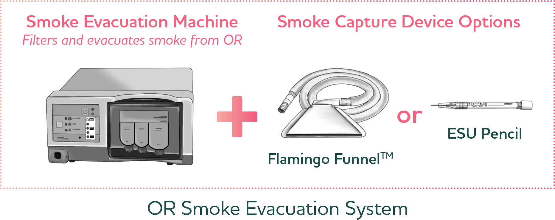 A smoke evacuation system has two parts – the evacuator (a vacuum pump) – and the smoke capture device (the Flamingo Funnel or ESU pencil). When it comes to smoke capture, one size does not fit all. It is important to evaluate multiple options to ensure you have the right solutions for various surgical needs.